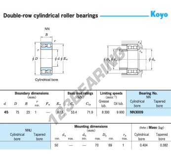 El Rodamiento Rodillos, conocido como NN3009-JTEKT JTEKT, tiene un diámetro interior de 45 mm, un diámetro exterior de 75 mm y un espesor de 23 mm.