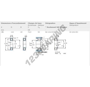 El Rodamiento Rodillos, conocido como NU1014-ECP-SKF SKF, tiene un diámetro interior de 70 mm, un diámetro exterior de 110 mm y un espesor de 20 mm.
