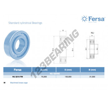 El Rodamiento Rodillos, conocido como NU2215-FM-ASFERSA ASFERSA, tiene un diámetro interior de 75 mm, un diámetro exterior de 130 mm y un espesor de 31 mm.