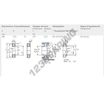 El Rodamiento Rodillos, conocido como NU310-ECM-SKF SKF, tiene un diámetro interior de 50 mm, un diámetro exterior de 110 mm y un espesor de 27 mm.