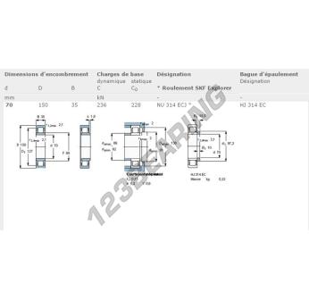 El Rodamiento Rodillos, conocido como NU314-ECJ-SKF SKF, tiene un diámetro interior de 70 mm, un diámetro exterior de 150 mm y un espesor de 35 mm.