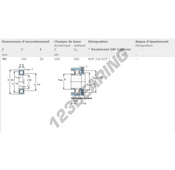 El Rodamiento Rodillos, conocido como NUP216-ECP-SKF SKF, tiene un diámetro interior de 80 mm, un diámetro exterior de 140 mm y un espesor de 26 mm.