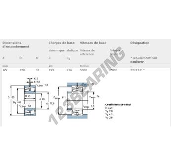 El Rodamiento De Rótulas En Rodillos, conocido como 22213-E-SKF SKF, tiene un diámetro interior de 65 mm, un diámetro exterior de 120 mm y un espesor de 31 mm.