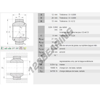 La Rótula Ge conocida como GE12-FO-INA INA tiene un diámetro interior de 12 mm, un diámetro exterior de 26 mm y un espesor de 15 mm.