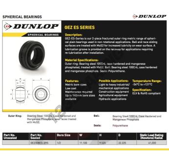 La Rótula Ge conocida como GEZ008-ES-2RS-DUNLOP DUNLOP tiene un diámetro interior de 12.7 mm, un diámetro exterior de 22.225 mm y un espesor de 11.1 mm.