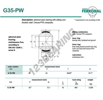 La Rótula Geew conocida como G35-PW-DURBAL DURBAL tiene un diámetro interior de 35 mm, un diámetro exterior de 62 mm y un espesor de 28 mm.