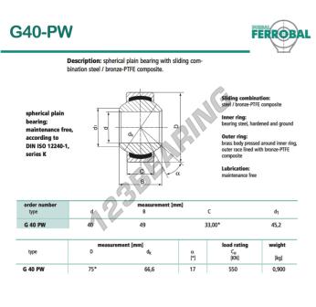 La Rótula Geew conocida como G40-PW-DURBAL DURBAL tiene un diámetro interior de 40 mm, un diámetro exterior de 75 mm y un espesor de 33 mm.