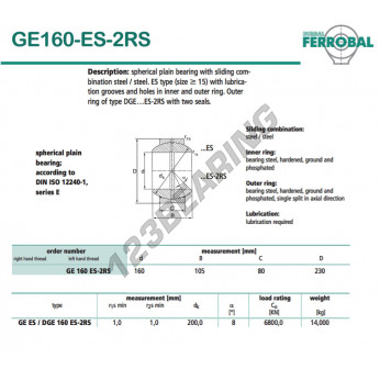La Rótula Geew conocida como GE160-ES-2RS-DURBAL DURBAL tiene un diámetro interior de 160 mm, un diámetro exterior de 230 mm y un espesor de 80 mm.