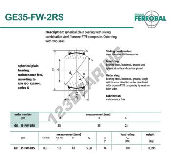 La Rótula Geew conocida como GE35-FW-2RS-DURBAL DURBAL tiene un diámetro interior de 35 mm, un diámetro exterior de 62 mm y un espesor de 23 mm.