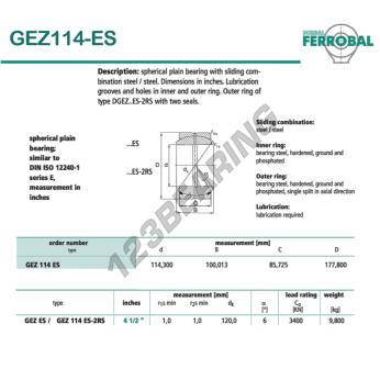 La Rótula Geew conocida como GEZ114-ES-DURBAL DURBAL tiene un diámetro interior de 114.3 mm, un diámetro exterior de 177.8 mm y un espesor de 85.725 mm.