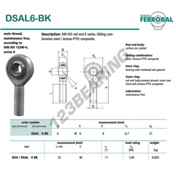 La Rótula Sa conocida como DSAL6-BK-DURBAL DURBAL tiene un paso de rosca de , un diámetro interior de 6 mm, un diámetro exterior de 21 mm y un espesor de 9 mm.