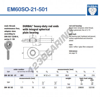La Rótula Sa conocida como EM60SO-21-501-DURBAL DURBAL tiene un paso de rosca de , un diámetro interior de 60 mm, un diámetro exterior de 135 mm y un espesor de 44 mm.