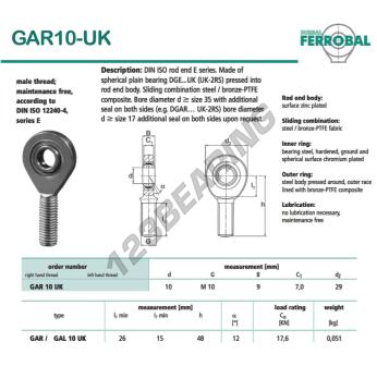 La Rótula Sa conocida como GAR10-UK-DURBAL DURBAL tiene un paso de rosca de , un diámetro interior de 10 mm, un diámetro exterior de 29 mm y un espesor de 9 mm.