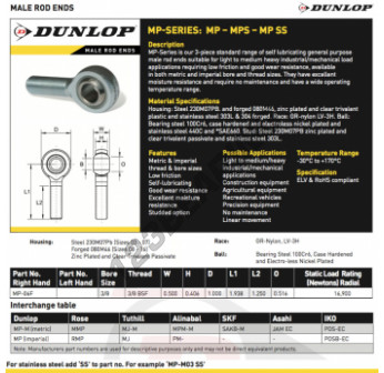 La Rótula Sa conocida como MP-06-F-DUNLOP DUNLOP tiene un paso de rosca de , un diámetro interior de 9.525 mm, un diámetro exterior de 25.4 mm y un espesor de 10.312 mm.