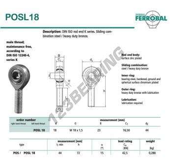 La Rótula Sa conocida como POSL18-DURBAL DURBAL tiene un paso de rosca de , un diámetro interior de 18 mm, un diámetro exterior de 44 mm y un espesor de 23 mm.