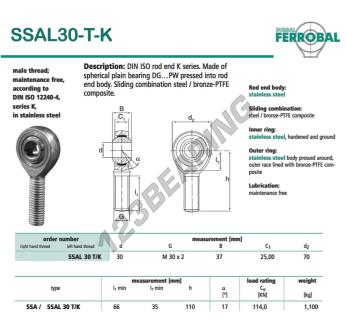 La Rótula Sa conocida como SSAL30-T-K-DURBAL DURBAL tiene un paso de rosca de , un diámetro interior de 30 mm, un diámetro exterior de 70 mm y un espesor de 37 mm.