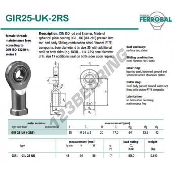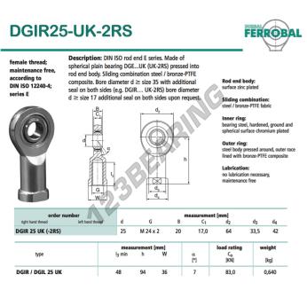 La Rótula Si conocida como DGIR25-UK-2RS-DURBAL DURBAL tiene un diámetro interior de 25 mm, un diámetro exterior de 64 mm y un espesor de 20 mm.