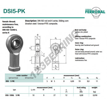 La Rótula Si conocida como DSI5-PK-DURBAL DURBAL tiene un diámetro interior de 5 mm, un diámetro exterior de 19 mm y un espesor de 8 mm.