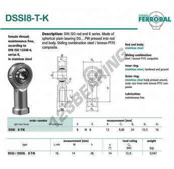 La Rótula Si conocida como DSSI8-T-K-DURBAL DURBAL tiene un diámetro interior de 8 mm, un diámetro exterior de 24 mm y un espesor de 12 mm.