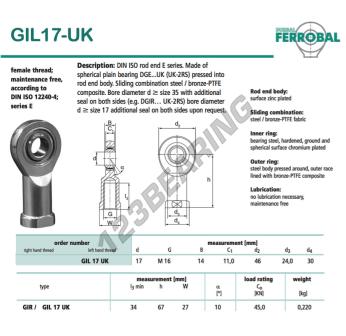 La Rótula Si conocida como GIL17-UK-DURBAL DURBAL tiene un diámetro interior de 17 mm, un diámetro exterior de 46 mm y un espesor de 14 mm.