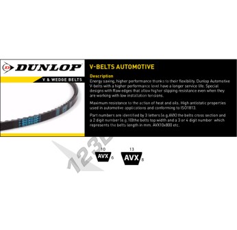 La correa AVX13X1425-DUNLOP de la familia de Correa Trapecial Dentada, marca DUNLOP, y perfil AVX13. Tiene una 13mm x 8mm con una longitud interna de 1375 mm, una longitud externa de 1425 mm, y una longitud primitiva de mm.