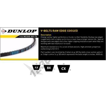 La correa AX41-DUNLOP de la familia de Correa Trapecial Dentada, marca DUNLOP, y perfil AX. Tiene una 13mm x 8mm con una longitud interna de 1041 mm, una longitud externa de 1091 mm, y una longitud primitiva de 1071 mm.